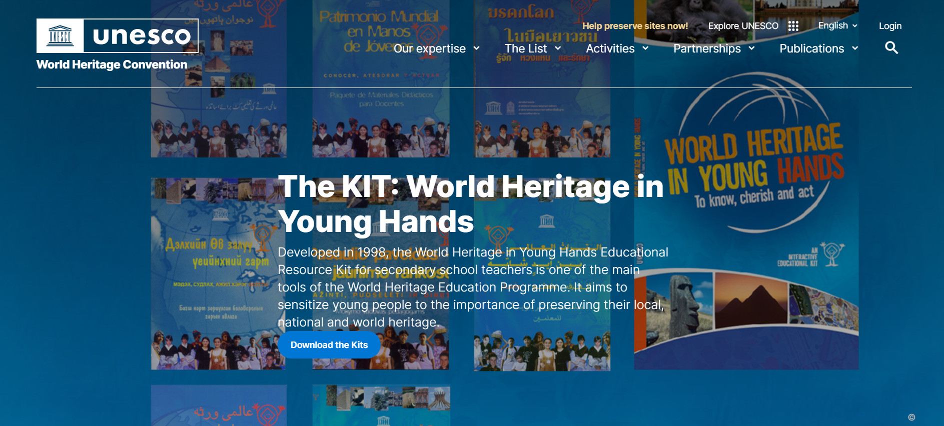 Developed in 1998, the World Heritage in Young Hands Educational Resource Kit for secondary school teachers is one of the main tools of the World Heritage Education Programme. It aims to sensitize young people to the importance of preserving their local, national and world heritage.