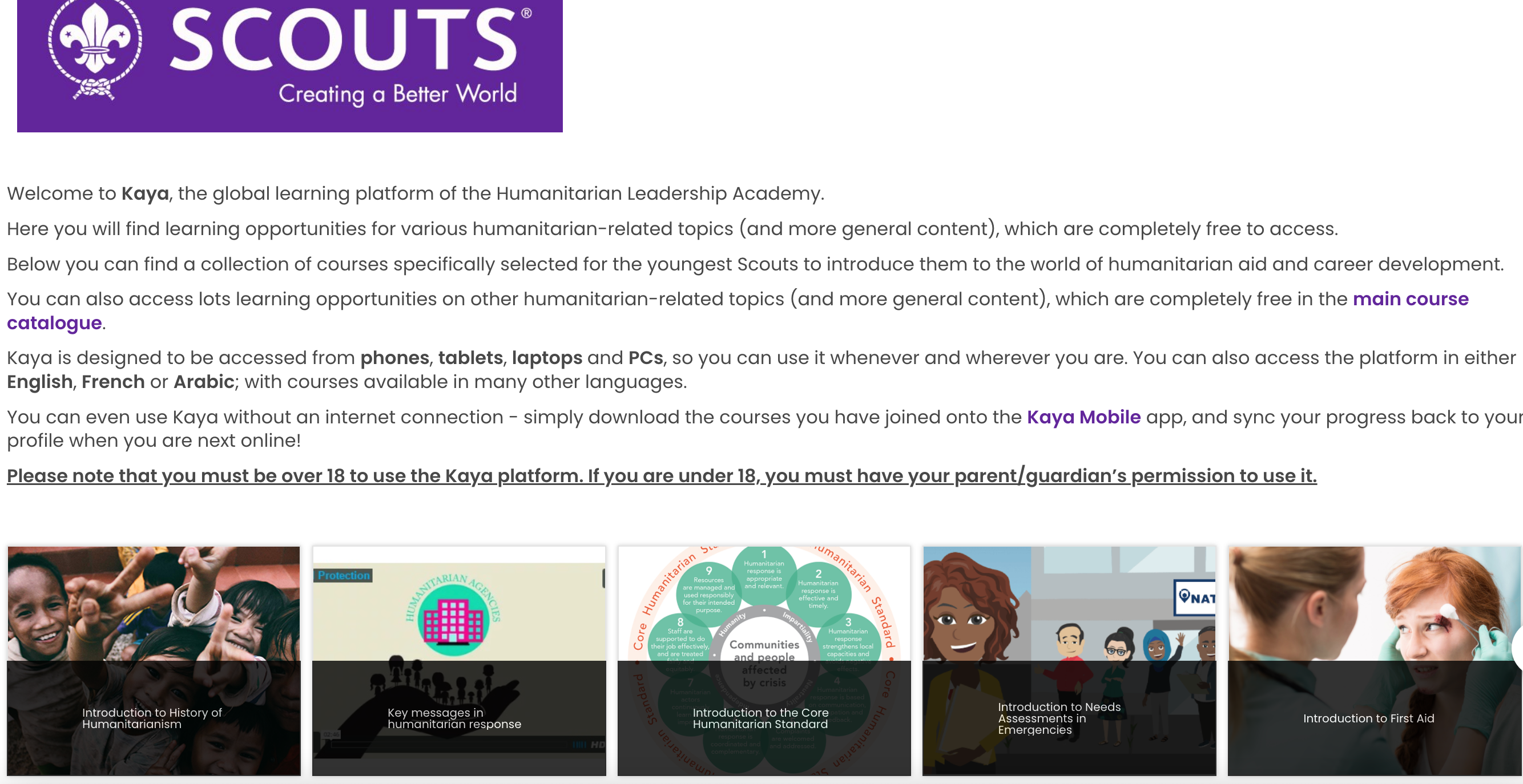 Welcome to Kaya, the global learning platform of the Humanitarian Leadership Academy. Here you will find learning opportunities for various humanitarian-related topics (and more general content), which are completely free to access.