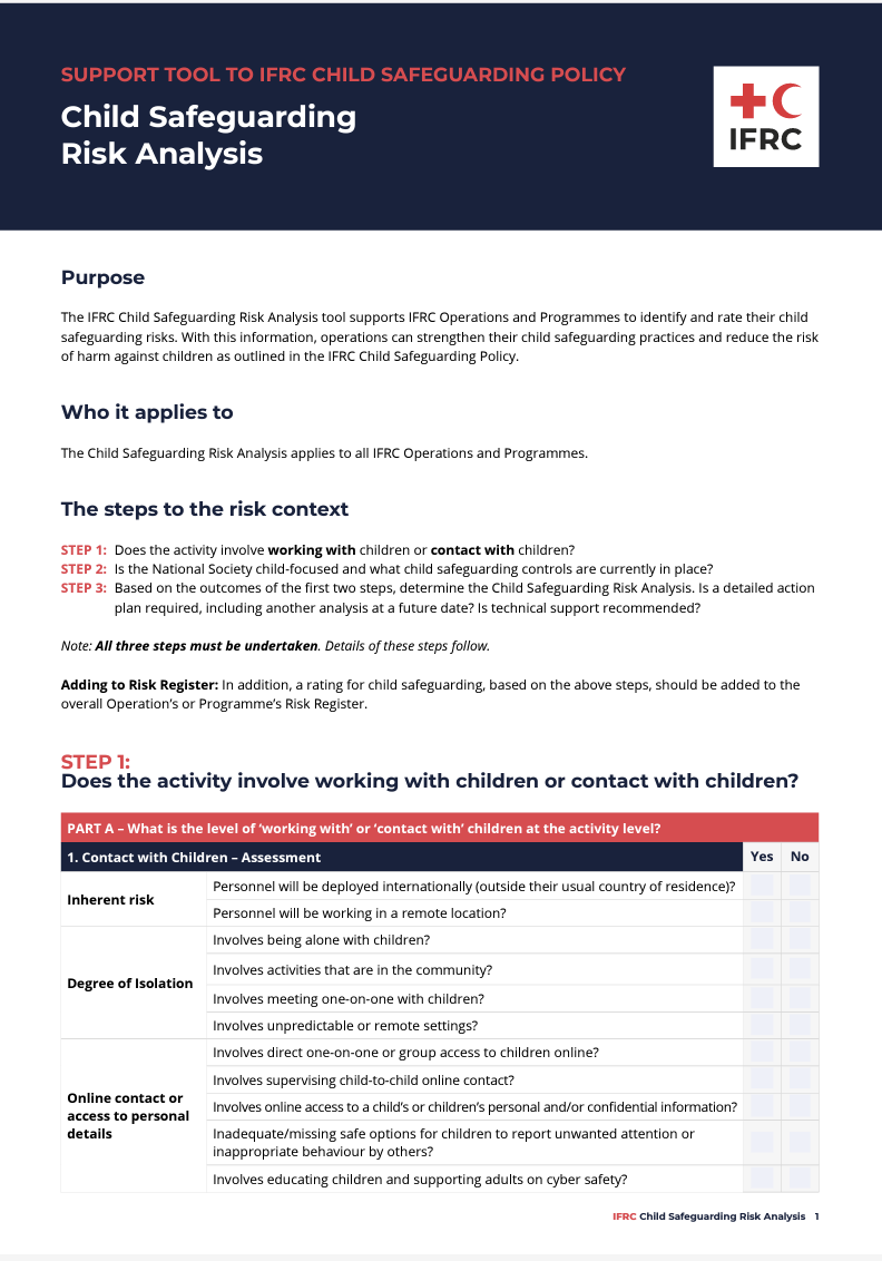 The IFRC Child Safeguarding Risk Analysis tool supports IFRC Operations and Programmes to identify and rate their child safeguarding risks.